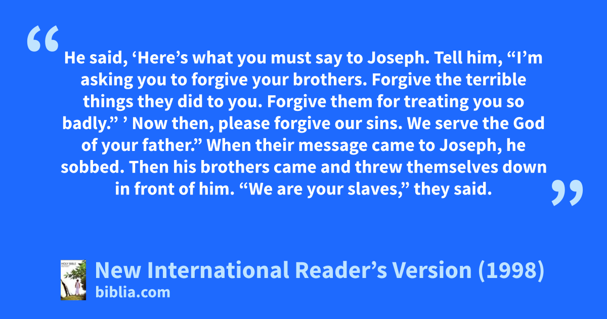 16So they sent a message to Joseph. They said, “Your father gave us directions before he died. 17He said, ‘Here’s what you must say to Joseph. Tell him, “I’m asking you to forgive your brothers. Forgive the terrible things they did to you. Forgive them for treating you so badly.” ’ Now then, please forgive our sins. We serve the God of your father.”