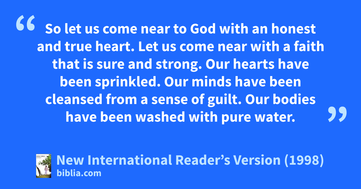 21We also have a great priest over the house of God. 22So let us come near to God with an honest and true heart. Let us come near with a faith that is sure and strong. Our hearts have been sprinkled. Our minds have been cleansed from a sense of guilt. Our bodies have been washed with pure water.