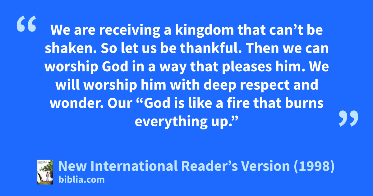 28We are receiving a kingdom that can’t be shaken. So let us be thankful. Then we can worship God in a way that pleases him. We will worship him with deep respect and wonder. 29Our “God is like a fire that burns everything up.” (Deuteronomy 4:24)
