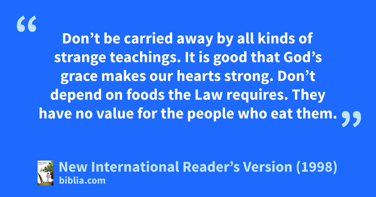 9Don’t be carried away by all kinds of strange teachings. It is good that God’s grace makes our hearts strong. Don’t depend on foods the Law requires. They have no value for the people who eat them. 10Some worship at the holy tent. But we have an altar that they have no right to eat from.