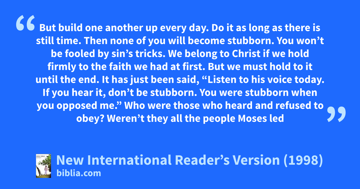 12Brothers and sisters, make sure that none of you has a sinful heart. Do not let an unbelieving heart turn you away from the living God. 13But build one another up every day. Do it as long as there is still time. Then none of you will become stubborn. You won’t be fooled by sin’s tricks.