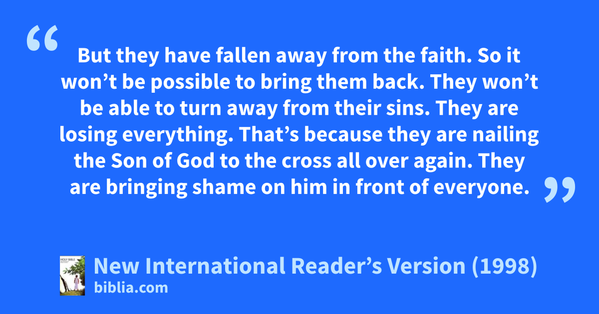 4What if some people fall away from the faith? It won’t be possible to bring them back. It is true that they have seen the light. They have tasted the heavenly gift. They have shared in the Holy Spirit. 5They have tasted the good things of God’s word. They have tasted the powers of the age to come. 6But they have fallen away from the faith. So it won’t be possible to bring them back. They won’t be able to turn away from their sins. They are losing everything. That’s because they are nailing the Son of God to the cross all over again. They are bringing shame on him in front of everyone.