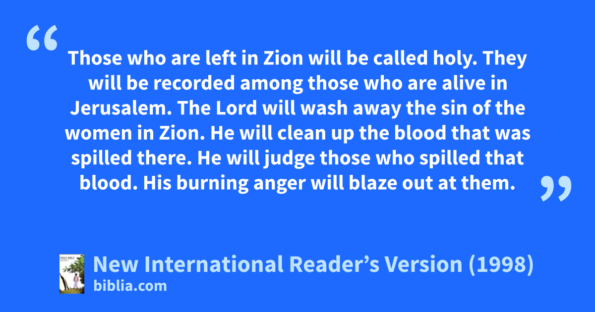 3Those who are left in Zion will be called holy. They will be recorded among those who are alive in Jerusalem. 4The Lord will wash away the sin of the women in Zion. He will clean up the blood that was spilled there. He will judge those who spilled that blood. His burning anger will blaze out at them.