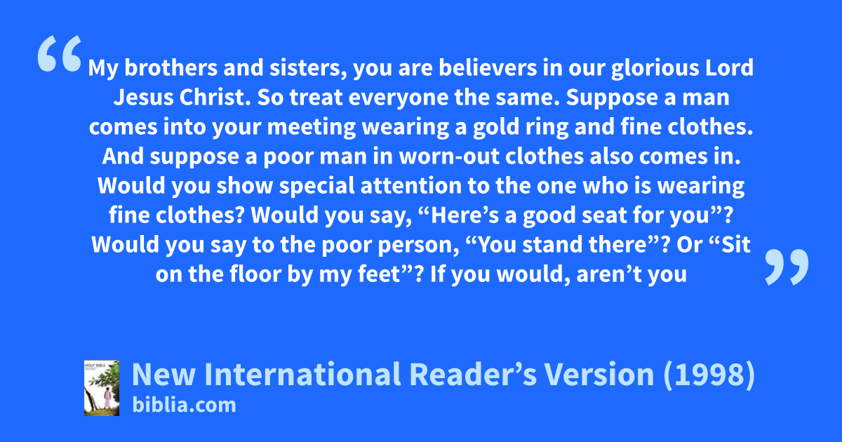 2Suppose a man comes into your meeting wearing a gold ring and fine clothes. And suppose a poor man in worn-out clothes also comes in. 3Would you show special attention to the one who is wearing fine clothes? Would you say, “Here’s a good seat for you”? Would you say to the poor person, “You stand there”? Or “Sit on the floor by my feet”? 4If you would, aren’t you treating some people better than others? Aren’t you like judges who have evil thoughts?