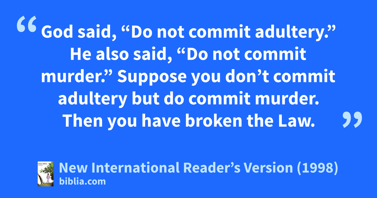 10Suppose you keep the whole law but trip over just one part of it. Then you are guilty of breaking all of it. 11God said, “Do not commit adultery.” (Exodus 20:14; Deuteronomy 5:18) He also said, “Do not commit murder.” (Exodus 20:13; Deuteronomy 5:17) Suppose you don’t commit adultery but do commit murder. Then you have broken the Law.