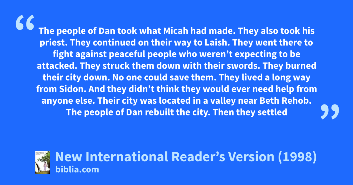 27The people of Dan took what Micah had made. They also took his priest. They continued on their way to Laish. They went there to fight against peaceful people who weren’t expecting to be attacked. They struck them down with their swords. They burned their city down. 28No one could save them. They lived a long way from Sidon. And they didn’t think they would ever need help from anyone else. Their city was located in a valley near Beth Rehob.