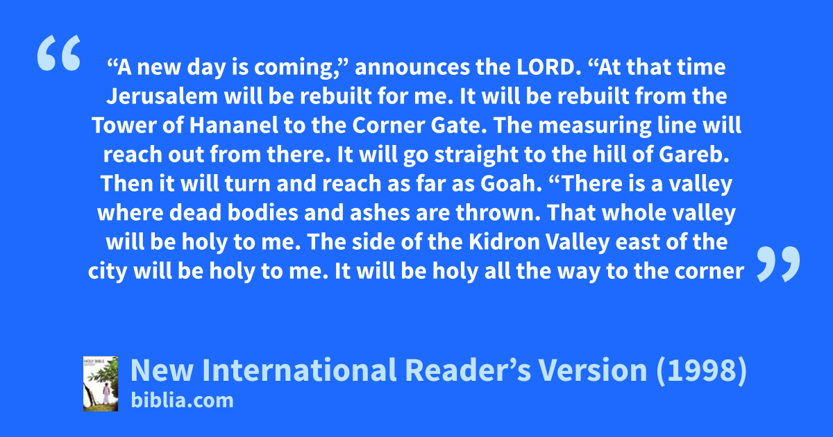 38“A new day is coming,” announces the Lord. “At that time Jerusalem will be rebuilt for me. It will be rebuilt from the Tower of Hananel to the Corner Gate. 39The measuring line will reach out from there. It will go straight to the hill of Gareb. Then it will turn and reach as far as Goah.