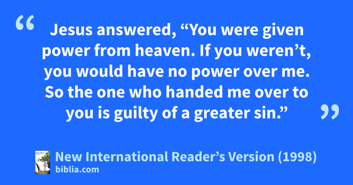 11Jesus answered, “You were given power from heaven. If you weren’t, you would have no power over me. So the one who handed me over to you is guilty of a greater sin.”