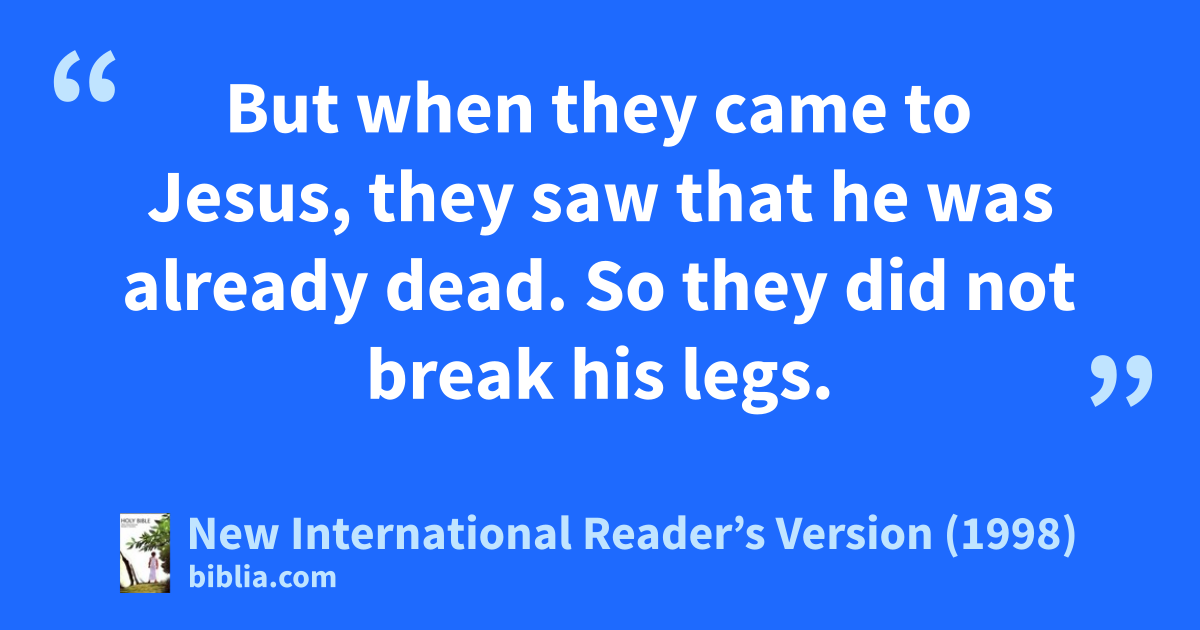 33But when they came to Jesus, they saw that he was already dead. So they did not break his legs. 34Instead, one of the soldiers stuck his spear into Jesus’ side. Right away, blood and water flowed out. 35The man who saw it has given witness. And his witness is true. He knows that he tells the truth. He gives witness so that you also can believe.