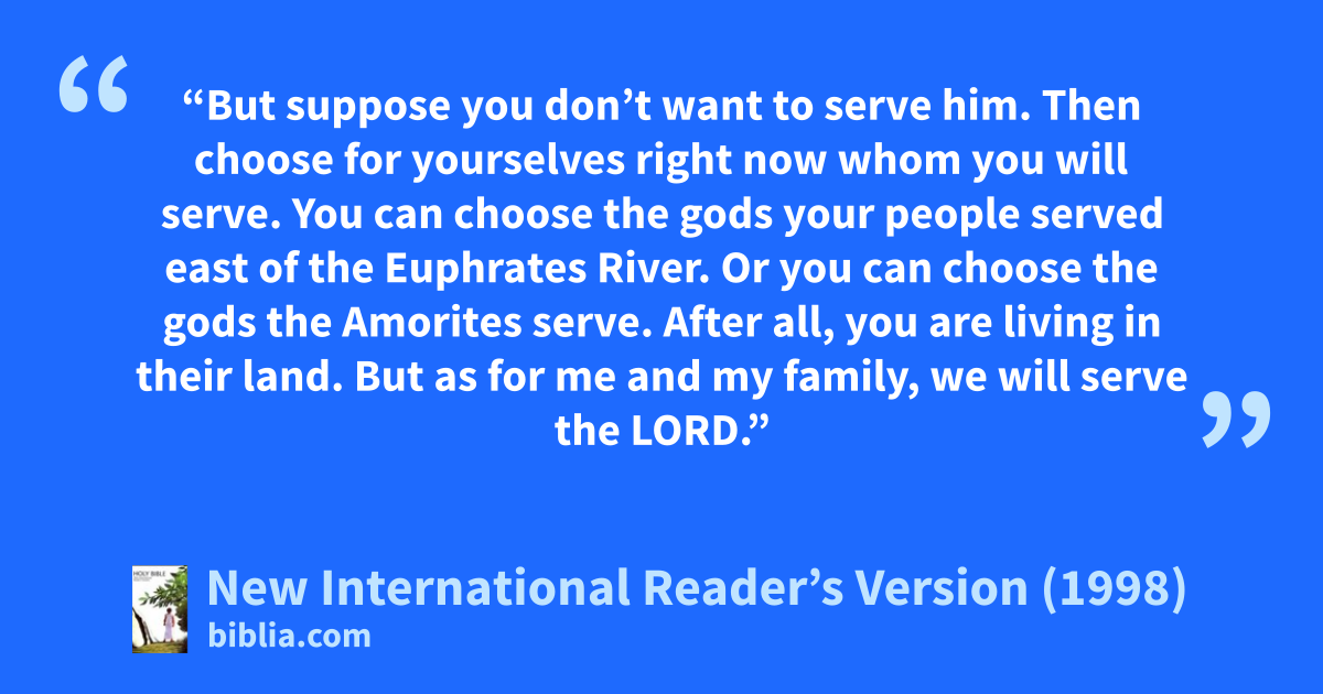 15“But suppose you don’t want to serve him. Then choose for yourselves right now whom you will serve. You can choose the gods your people served east of the Euphrates River. Or you can choose the gods the Amorites serve. After all, you are living in their land. But as for me and my family, we will serve the Lord.”