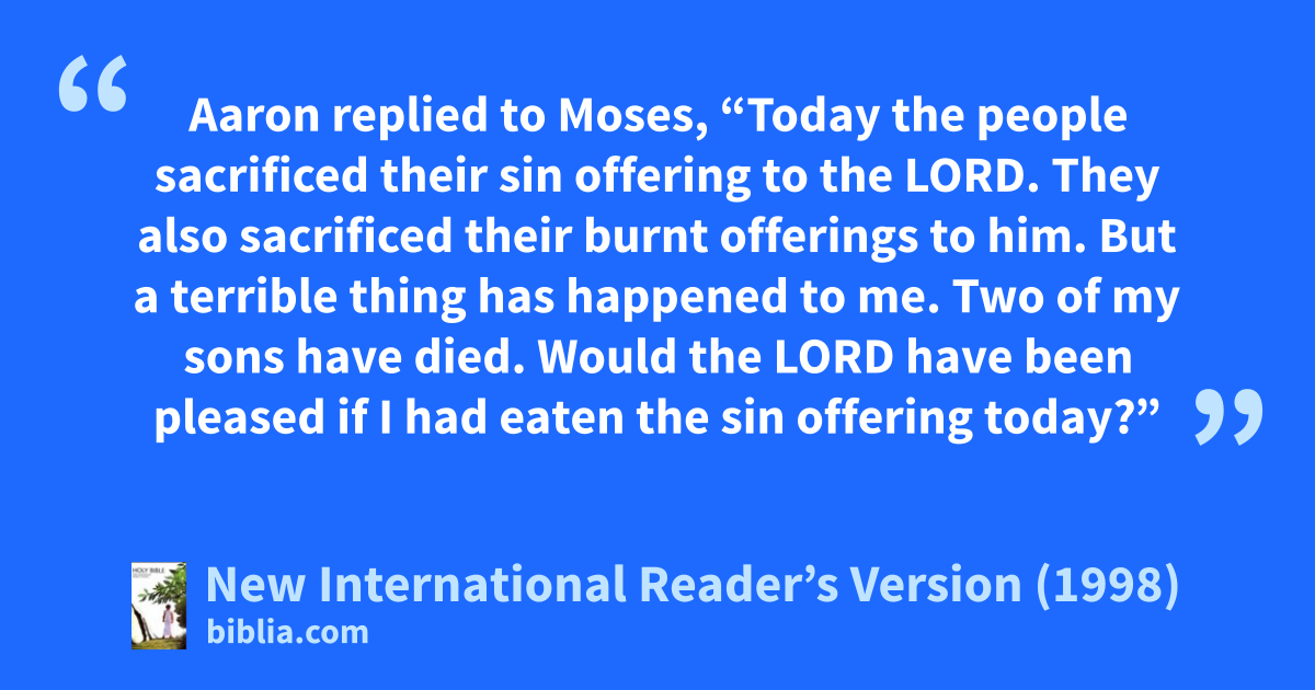 19Aaron replied to Moses, “Today the people sacrificed their sin offering to the Lord. They also sacrificed their burnt offerings to him. But a terrible thing has happened to me. Two of my sons have died. Would the Lord have been pleased if I had eaten the sin offering today?” 20When Moses heard that, he was satisfied.
