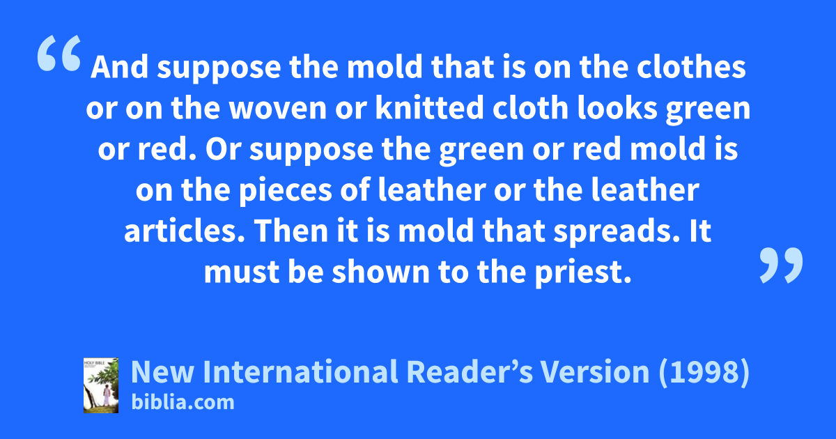47“Suppose some clothes have mold on them. The clothes could be made out of wool or linen. 48Or there could be cloth that is woven or knitted out of linen or wool. There could be pieces of leather. Or there could be articles that are made out of leather. 49And suppose the mold that is on the clothes or on the woven or knitted cloth looks green or red. Or suppose the green or red mold is on the pieces of leather or the leather articles. Then it is mold that spreads. It must be shown to the priest.