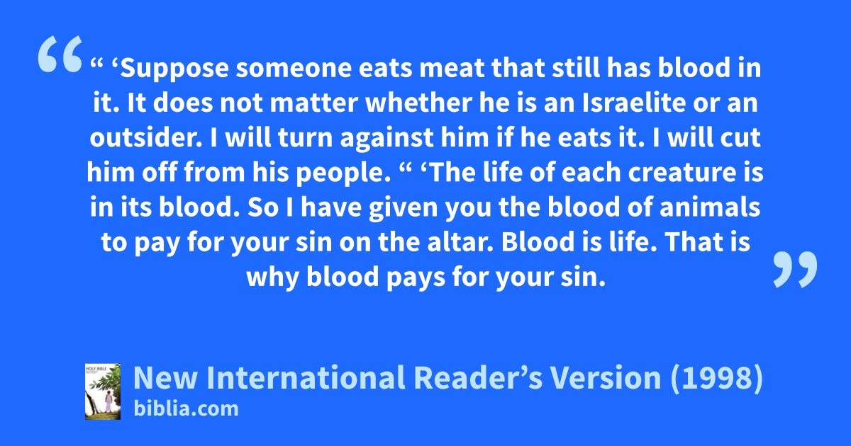 10“ ‘Suppose someone eats meat that still has blood in it. It does not matter whether he is an Israelite or an outsider. I will turn against him if he eats it. I will cut him off from his people.