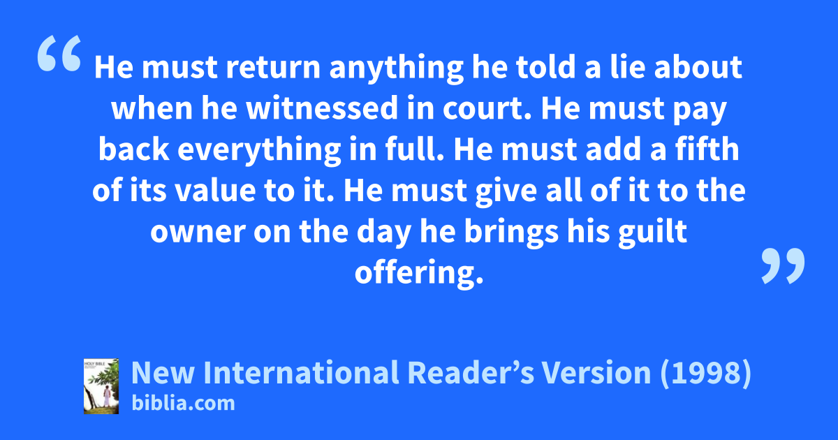 4“When he sins in any of those ways, he becomes guilty. He must return what he stole. He must give back what he took by cheating his neighbors. He must return what they placed in his care. He must return the lost property he found. 5He must return anything he told a lie about when he witnessed in court. He must pay back everything in full. He must add a fifth of its value to it. He must give all of it to the owner on the day he brings his guilt offering.