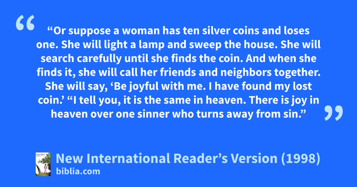 8“Or suppose a woman has ten silver coins and loses one. She will light a lamp and sweep the house. She will search carefully until she finds the coin. 9And when she finds it, she will call her friends and neighbors together. She will say, ‘Be joyful with me. I have found my lost coin.’