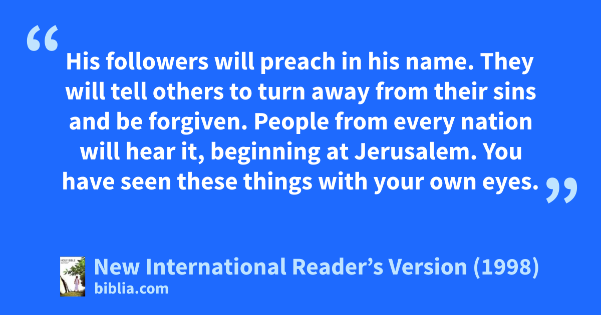 45Then he opened their minds so they could understand the Scriptures. 46He told them, “This is what is written. The Christ will suffer. He will rise from the dead on the third day. 47His followers will preach in his name. They will tell others to turn away from their sins and be forgiven. People from every nation will hear it, beginning at Jerusalem. 48You have seen these things with your own eyes.