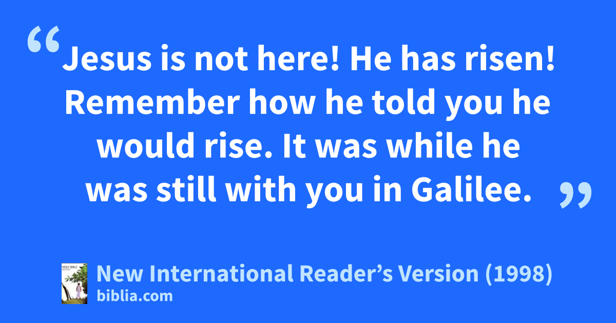 Then the men said to them, “Why do you look for the living among the dead? 6Jesus is not here! He has risen! Remember how he told you he would rise. It was while he was still with you in Galilee. 7He said, ‘The Son of Man must be handed over to sinful people. He must be nailed to a cross. On the third day he will rise from the dead.’ ”