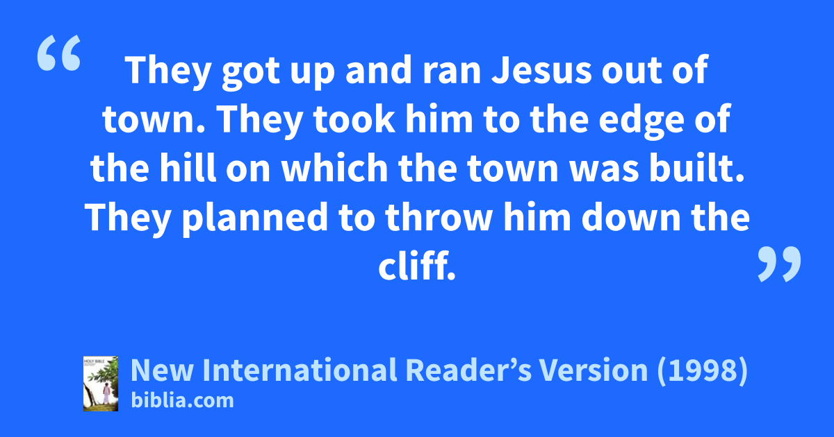 28All the people in the synagogue were very angry when they heard that. 29They got up and ran Jesus out of town. They took him to the edge of the hill on which the town was built. They planned to throw him down the cliff. 30But Jesus walked right through the crowd and went on his way.