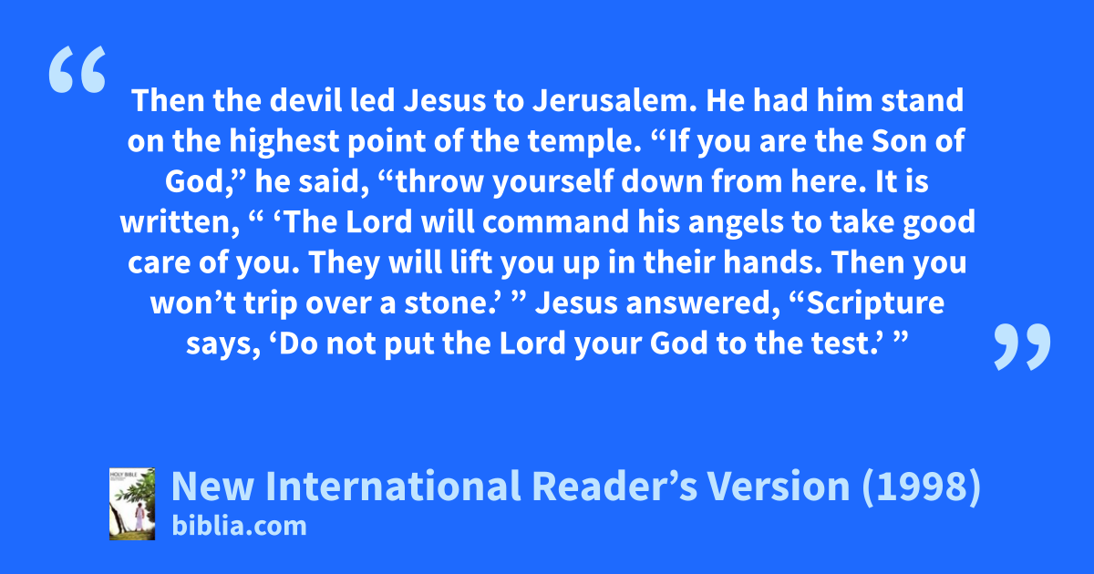 9Then the devil led Jesus to Jerusalem. He had him stand on the highest point of the temple. “If you are the Son of God,” he said, “throw yourself down from here. 10It is written,