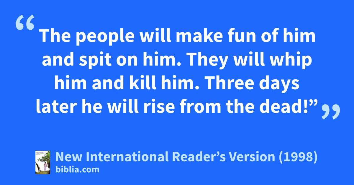 Again Jesus took the Twelve to one side. He told them what was going to happen to him. 33“We are going up to Jerusalem,” he said. “The Son of Man will be handed over to the chief priests and the teachers of the law. They will sentence him to death. Then they will hand him over to people who are not Jews. 34The people will make fun of him and spit on him. They will whip him and kill him. Three days later he will rise from the dead!”