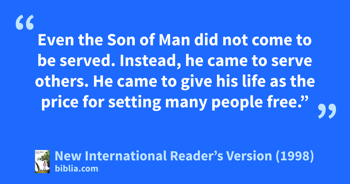 42Jesus called them together. He said, “You know about those who are rulers of the nations. They hold power over their people. Their high officials order them around. 43Don’t be like that. Instead, anyone who wants to be important among you must be your servant. 44And anyone who wants to be first must be the slave of everyone. 45Even the Son of Man did not come to be served. Instead, he came to serve others. He came to give his life as the price for setting many people free.”