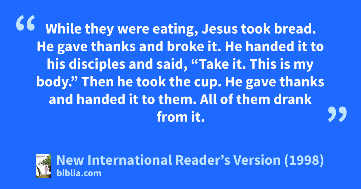 22While they were eating, Jesus took bread. He gave thanks and broke it. He handed it to his disciples and said, “Take it. This is my body.”