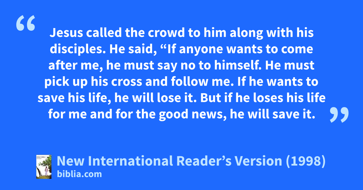 34Jesus called the crowd to him along with his disciples. He said, “If anyone wants to come after me, he must say no to himself. He must pick up his cross and follow me. 35If he wants to save his life, he will lose it. But if he loses his life for me and for the good news, he will save it. 36What good is it if someone gains the whole world but loses his soul? 37Or what can anyone trade for his soul?