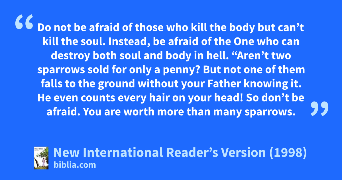 26“So don’t be afraid of your enemies. Everything that is secret will be brought out into the open. Everything that is hidden will be uncovered. 27What I tell you in the dark, speak in the daylight. What is whispered in your ear, shout from the rooftops. 28Do not be afraid of those who kill the body but can’t kill the soul. Instead, be afraid of the One who can destroy both soul and body in hell.