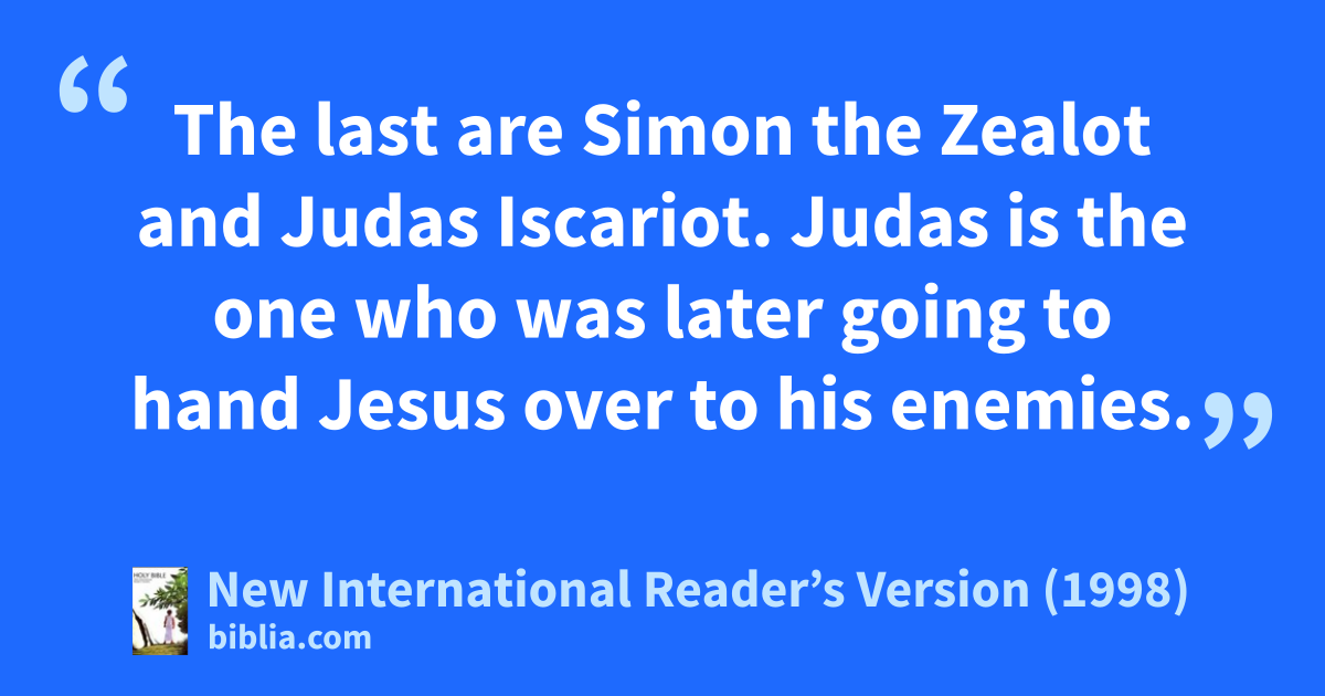 2Here are the names of the 12 apostles. First are Simon Peter and his brother Andrew. Then come James, son of Zebedee, and his brother John. 3 Next are Philip and Bartholomew, and also Thomas and Matthew the tax collector. Two more are James, son of Alphaeus, and Thaddaeus. 4The last are Simon the Zealot and Judas Iscariot. Judas is the one who was later going to hand Jesus over to his enemies.