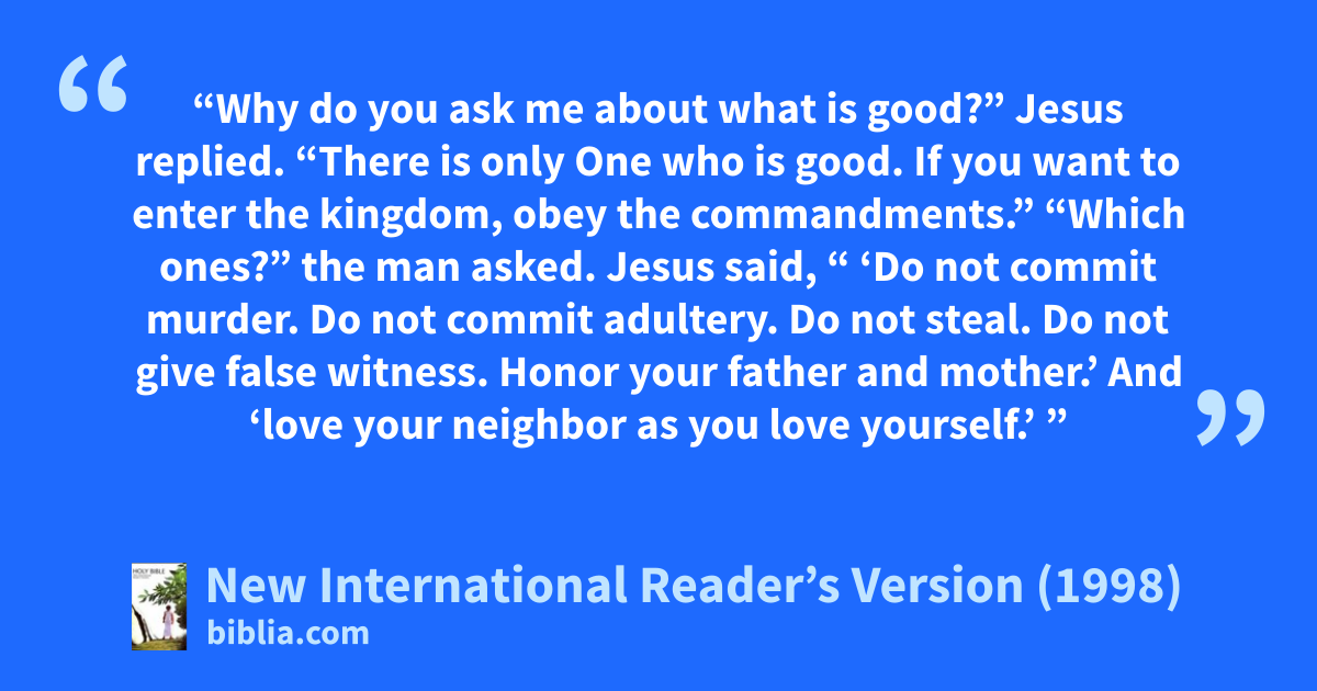 Jesus said, “ ‘Do not commit murder. Do not commit adultery. Do not steal. Do not give false witness. 19Honor your father and mother.’ (Exodus 20:12–16; Deuteronomy 5:16–20) And ‘love your neighbor as you love yourself.’ ” (Leviticus 19:18)