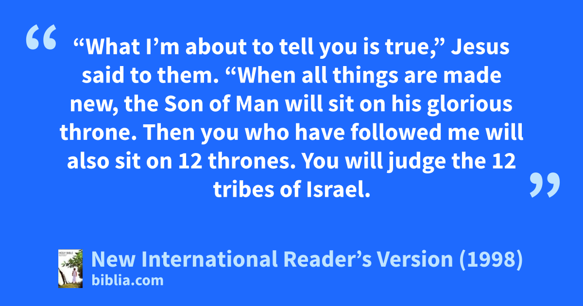 28“What I’m about to tell you is true,” Jesus said to them. “When all things are made new, the Son of Man will sit on his glorious throne. Then you who have followed me will also sit on 12 thrones. You will judge the 12 tribes of Israel. 29Everyone who has left houses or families or fields because of me will receive 100 times as much. They will also receive eternal life. 30But many who are first will be last. And many who are last will be first.