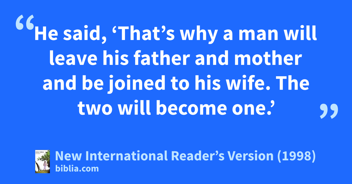 4Jesus replied, “Haven’t you read that in the beginning the Creator ‘made them male and female’? (Genesis 1:27) 5He said, ‘That’s why a man will leave his father and mother and be joined to his wife. The two will become one.’ (Genesis 2:24) 6They are no longer two, but one. So a man must not separate what God has joined together.”