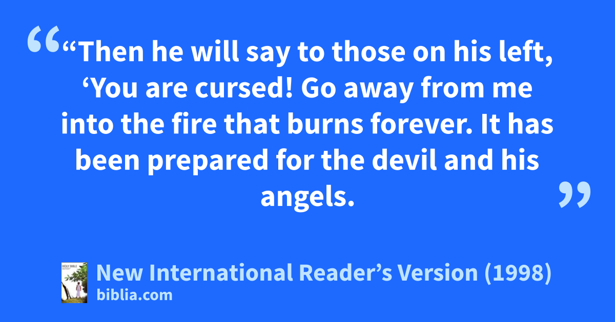 41“Then he will say to those on his left, ‘You are cursed! Go away from me into the fire that burns forever. It has been prepared for the devil and his angels. 42I was hungry. But you gave me nothing to eat. I was thirsty. But you gave me nothing to drink. 43I was a stranger. But you did not invite me in. I needed clothes. But you did not give me any. I was sick and in prison. But you did not take care of me.’