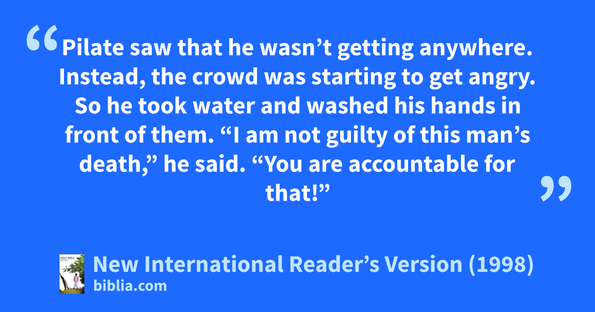 24Pilate saw that he wasn’t getting anywhere. Instead, the crowd was starting to get angry. So he took water and washed his hands in front of them. “I am not guilty of this man’s death,” he said. “You are accountable for that!”