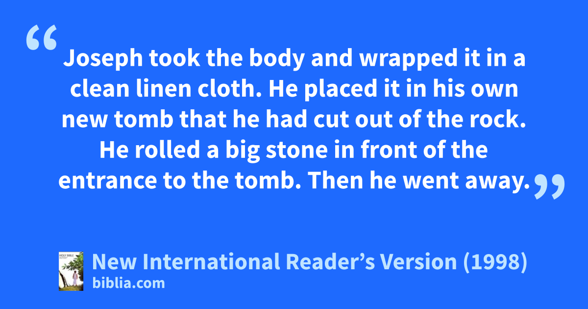 59Joseph took the body and wrapped it in a clean linen cloth. 60He placed it in his own new tomb that he had cut out of the rock. He rolled a big stone in front of the entrance to the tomb. Then he went away.