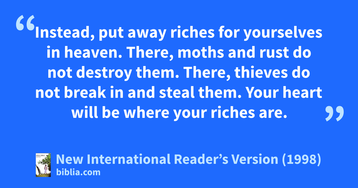 19“Do not put away riches for yourselves on earth. Moths and rust can destroy them. Thieves can break in and steal them. 20Instead, put away riches for yourselves in heaven. There, moths and rust do not destroy them. There, thieves do not break in and steal them. 21Your heart will be where your riches are.