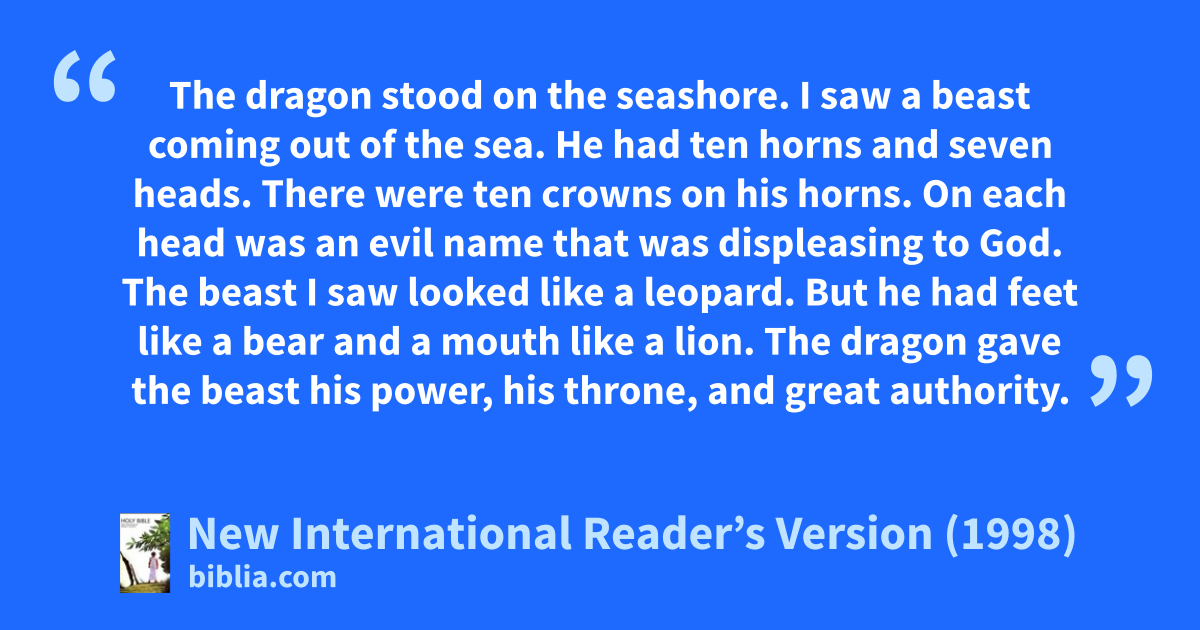 2The beast I saw looked like a leopard. But he had feet like a bear and a mouth like a lion. The dragon gave the beast his power, his throne, and great authority. 3One of the beast’s heads seemed to have had a deadly wound. But the wound had been healed. The whole world was amazed and followed the beast.