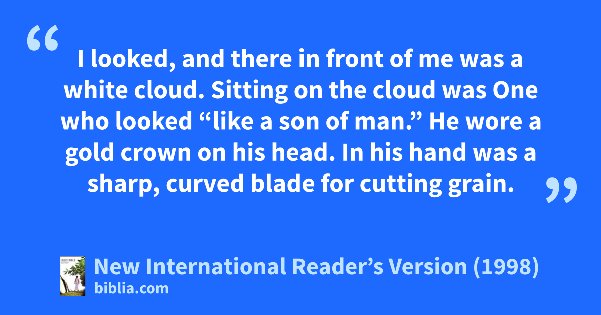 14I looked, and there in front of me was a white cloud. Sitting on the cloud was One who looked “like a son of man.” (Daniel 7:13) He wore a gold crown on his head. In his hand was a sharp, curved blade for cutting grain.