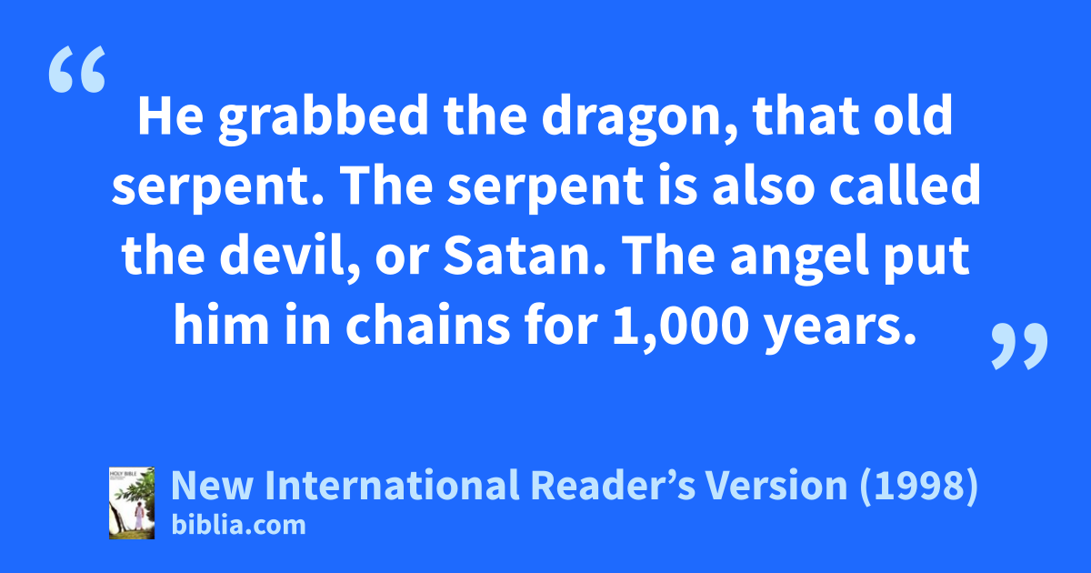 2He grabbed the dragon, that old serpent. The serpent is also called the devil, or Satan. The angel put him in chains for 1,000 years. 3Then he threw him into the Abyss. He locked it and sealed him in. This was to keep Satan from fooling the nations anymore until the 1,000 years were ended. After that, he must be set free for a short time.