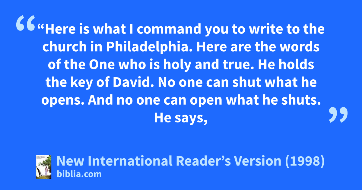 Here are the words of the One who is holy and true. He holds the key of David. No one can shut what he opens. And no one can open what he shuts. He says, 8‘I know what you are doing. Look! I have put an open door in front of you. No one can shut it. I know that you don’t have much strength. But you have obeyed my word. You have not said no to me.