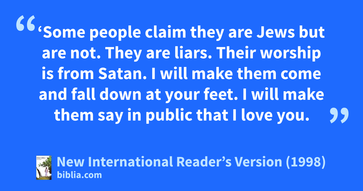 9‘Some people claim they are Jews but are not. They are liars. Their worship is from Satan. I will make them come and fall down at your feet. I will make them say in public that I love you.