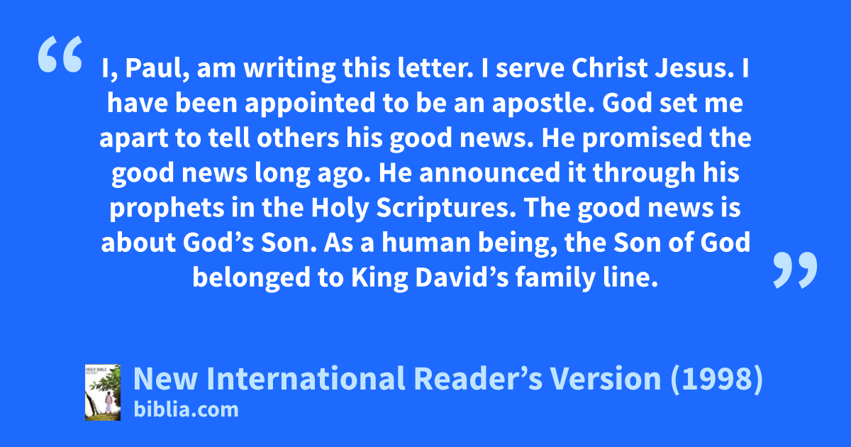 1 I, Paul, am writing this letter. I serve Christ Jesus. I have been appointed to be an apostle. God set me apart to tell others his good news. 2He promised the good news long ago. He announced it through his prophets in the Holy Scriptures.