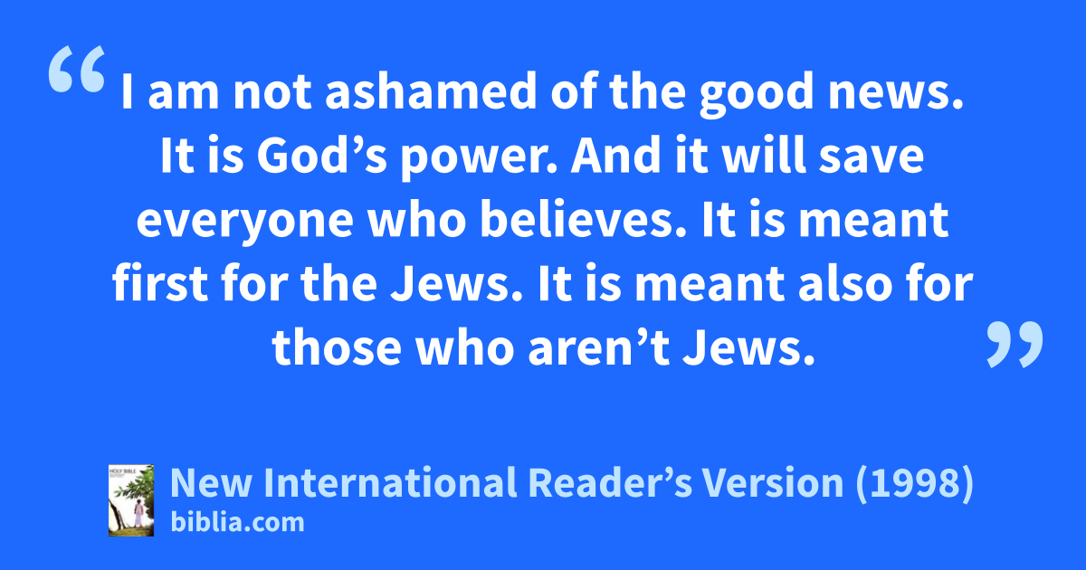 16I am not ashamed of the good news. It is God’s power. And it will save everyone who believes. It is meant first for the Jews. It is meant also for those who aren’t Jews.