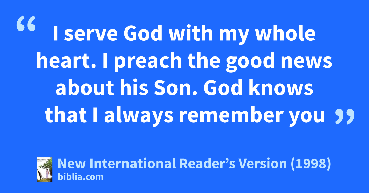 8First, I thank my God through Jesus Christ for all of you. People all over the world are talking about your faith. 9I serve God with my whole heart. I preach the good news about his Son. God knows that I always remember you 10in my prayers. I pray that now at last it may be God’s plan to open the way for me to visit you.