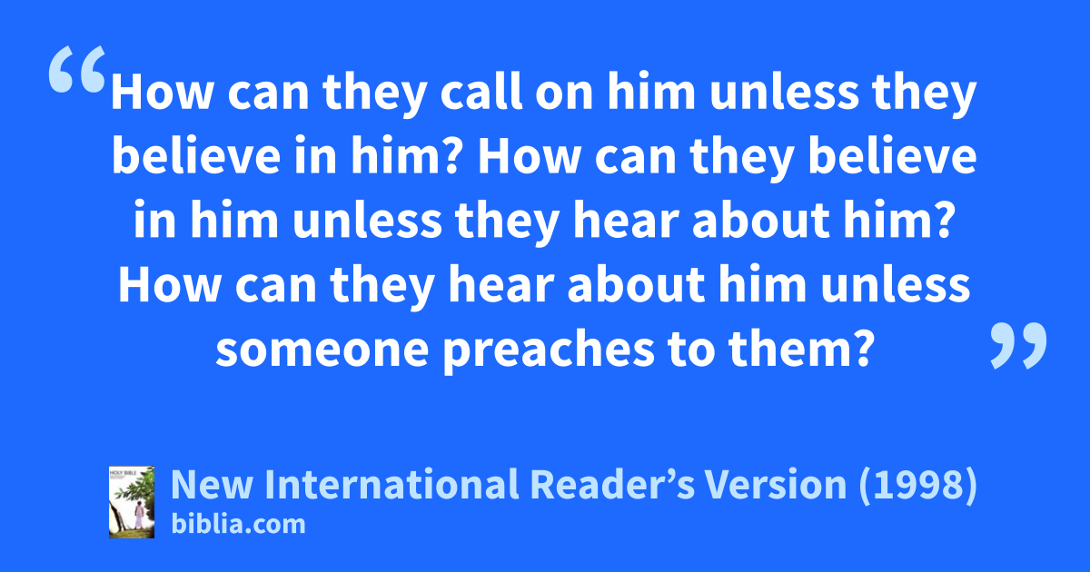 14How can they call on him unless they believe in him? How can they believe in him unless they hear about him? How can they hear about him unless someone preaches to them? 15And how can anyone preach without being sent? It is written, “How beautiful are the feet of those who bring good news!” (Isaiah 52:7)