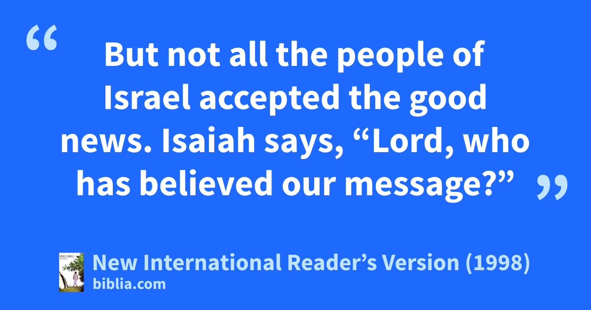 16But not all the people of Israel accepted the good news. Isaiah says, “Lord, who has believed our message?” (Isaiah 53:1) 17So faith comes from hearing the message. And the message that is heard is the word of Christ.