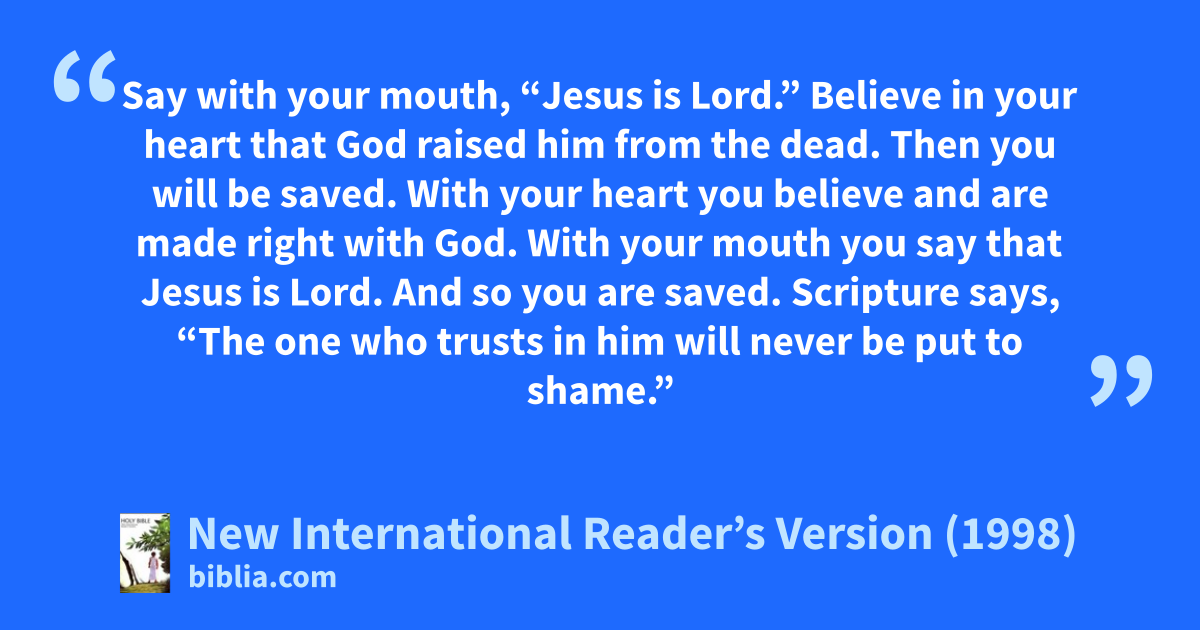 9Say with your mouth, “Jesus is Lord.” Believe in your heart that God raised him from the dead. Then you will be saved. 10With your heart you believe and are made right with God. With your mouth you say that Jesus is Lord. And so you are saved. 11Scripture says, “The one who trusts in him will never be put to shame.” (Isaiah 28:16)
