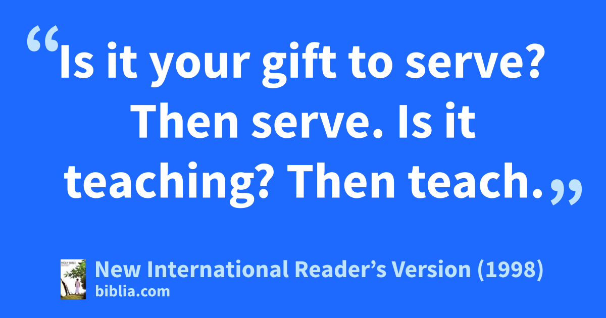 6We all have gifts. They differ in keeping with the grace that God has given each of us. Do you have the gift of prophecy? Then use it in keeping with the faith you have. 7Is it your gift to serve? Then serve. Is it teaching? Then teach. 8Is it telling others how they should live? Then tell them. Is it giving to those who are in need? Then give freely. Is it being a leader? Then work hard at it. Is it showing mercy? Then do it cheerfully.