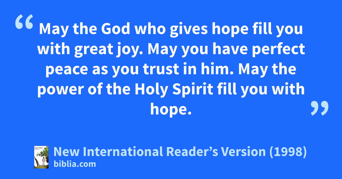 13May the God who gives hope fill you with great joy. May you have perfect peace as you trust in him. May the power of the Holy Spirit fill you with hope.