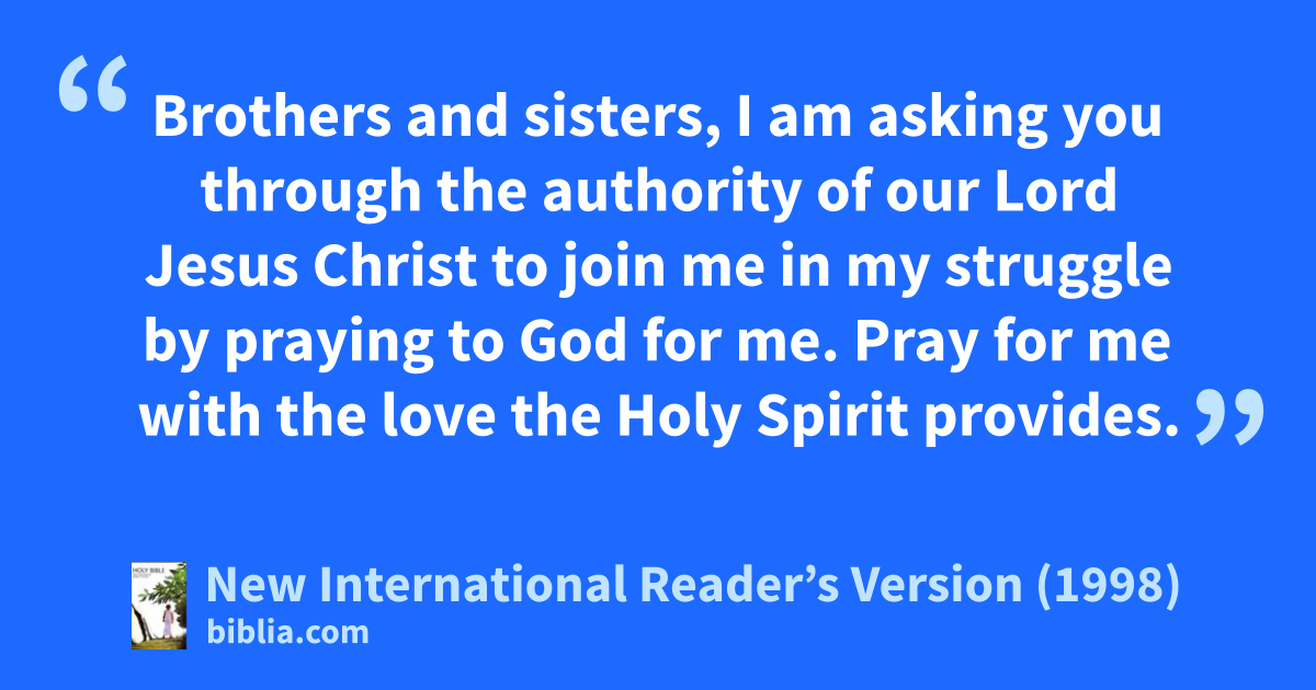 30Brothers and sisters, I am asking you through the authority of our Lord Jesus Christ to join me in my struggle by praying to God for me. Pray for me with the love the Holy Spirit provides. 31Pray that I will be saved from those in Judea who do not believe. Pray that my work in Jerusalem will be accepted by God’s people there. 32Then, as God has planned, I will come to you with joy. Together we will be renewed.